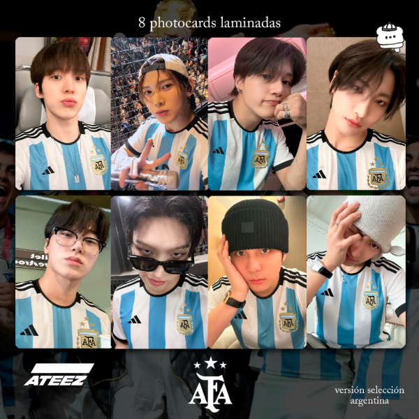 8 photocards laminadas (si elegís doble faz atrás van el escudo de la selección y de skz)