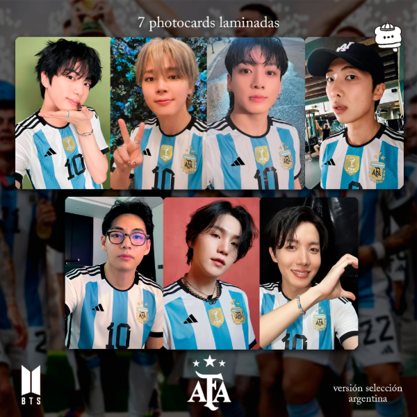 7 photocards laminadas (si elegís doble faz atrás van el escudo de la selección y de bts)
